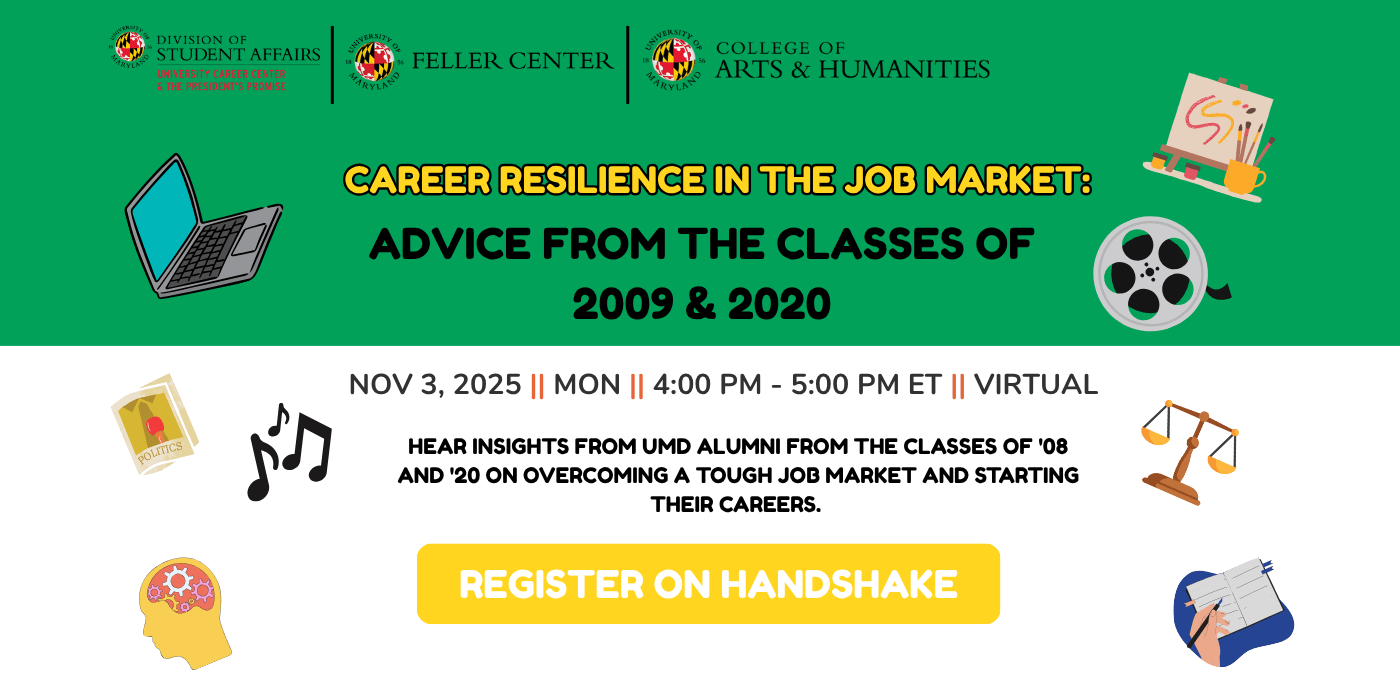 Hear from UMD alums from the class of ‘08 and ’20 on how they navigated a challenging job market and launched themselves into their chosen career paths. Alumni panelists will be named here closer to the event date.